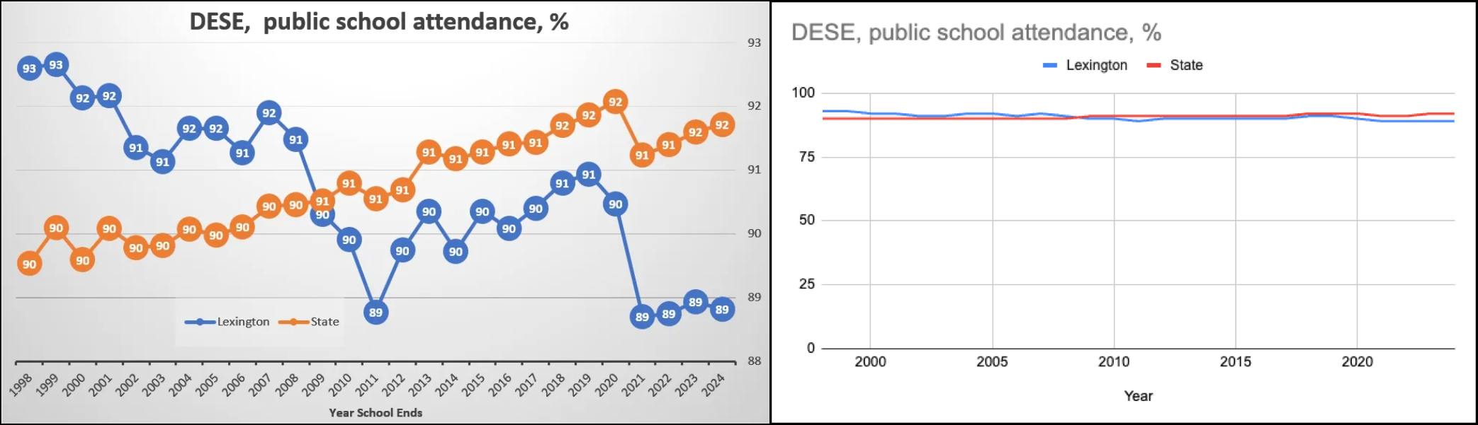In addition, I was not referring to Lana Panasyuk’s second graph, “DSDE # of Lexington Students in Private Schools,” which featured a Y-axis ranging from 400 to 900—covering more than 50% of the total range of the Y-axis data. That second graph in her letter presented the data effectively. My comments instead pertain to the first graph in her letter, where the Y-axis ranged from 89 to 93, representing only 4% of the full Y-axis range. This limited scale artificially amplified the visual impact of the data — as they taught me in my statistics class at Yale in 1965. It’s not BSG, but Yale and subsequently MIT have pretty good reputations in teaching mathematics…